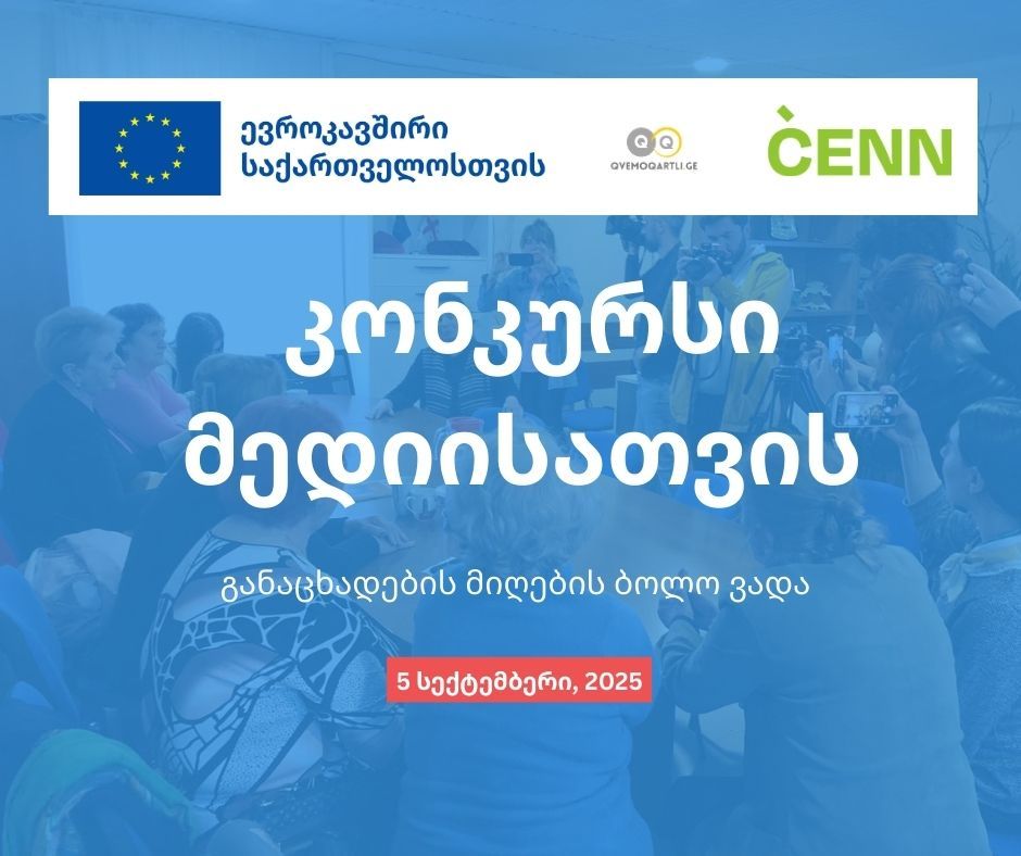 CENN, ევროკავშირის მიერ მხარდაჭერილი პროექტის “სამოქალაქო საზოგადოების გაძლიერება ინკლუზიური და მწვანე აღდგენისათვის’’ ფარგლებში, აცხადებს მედია კონკურსს ცენტრალური, სამცხე-ჯავახეთისა და ქვემო ქართლის რეგიონული მედიის წარმომადგენლებისათვის.