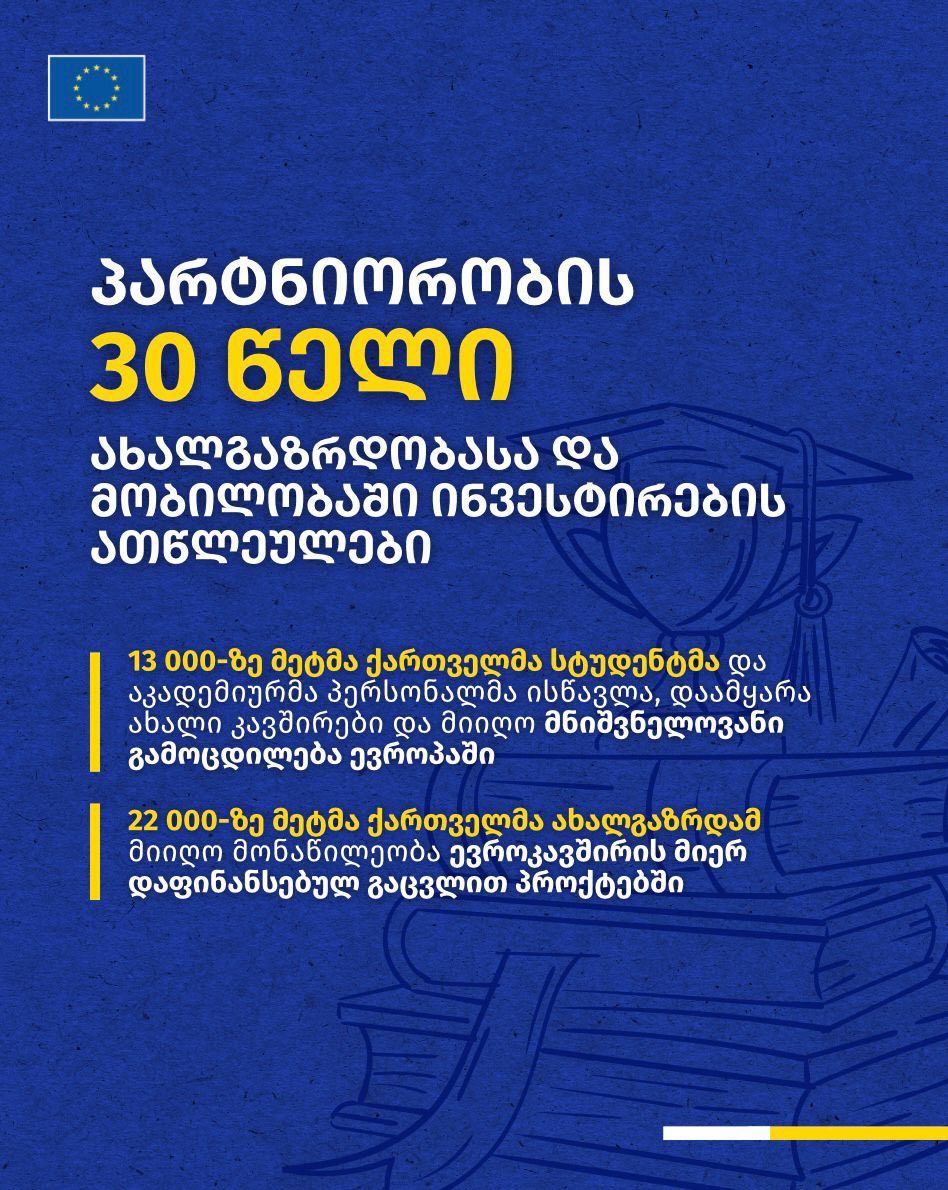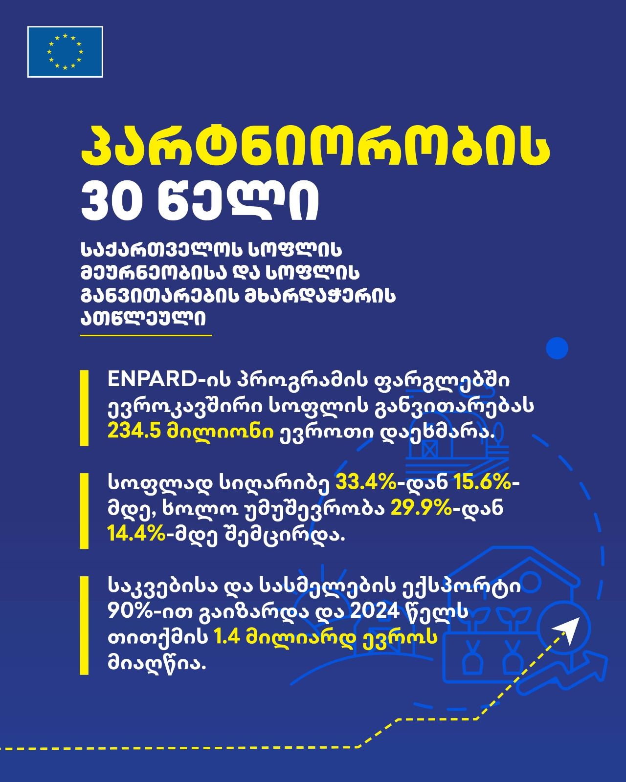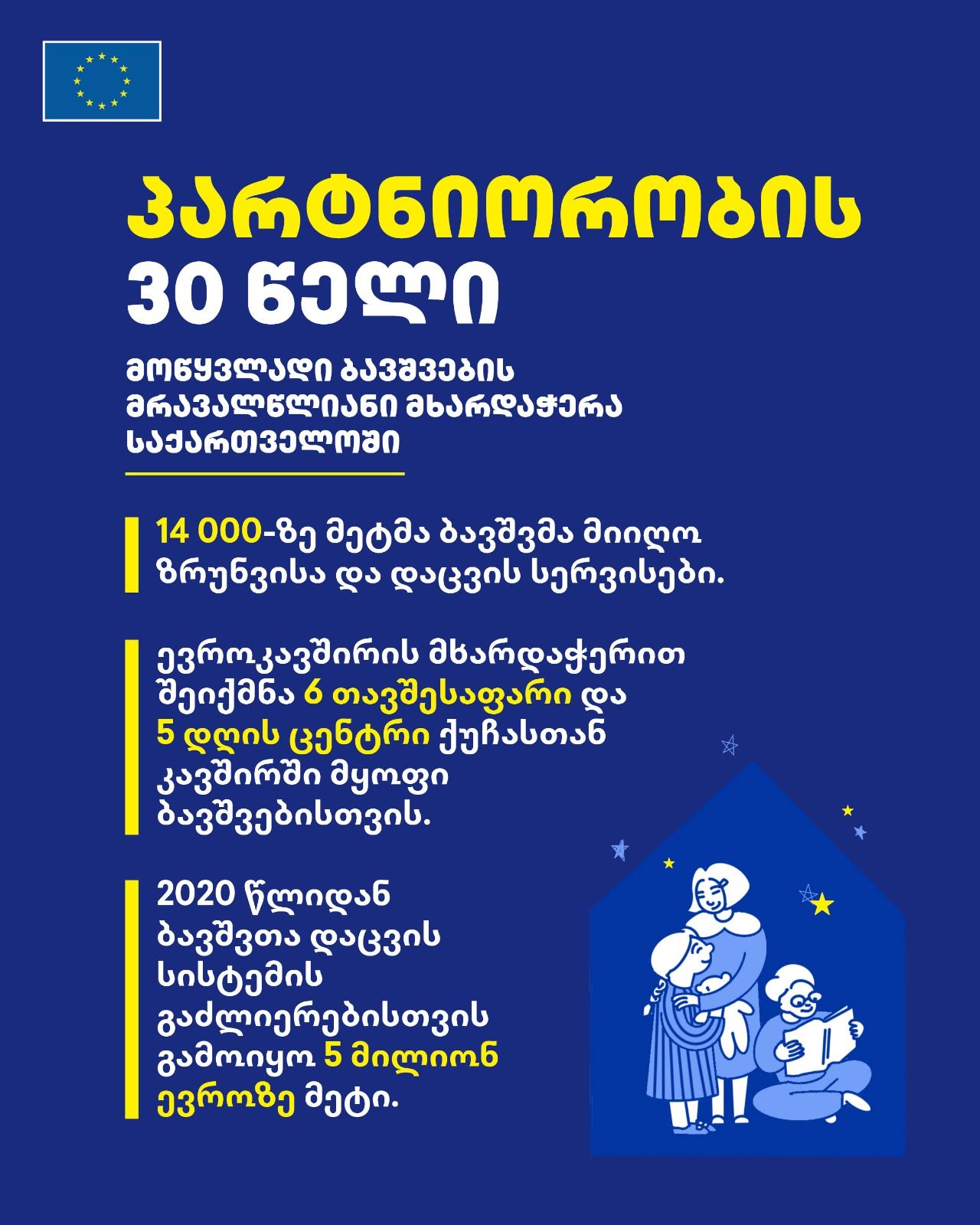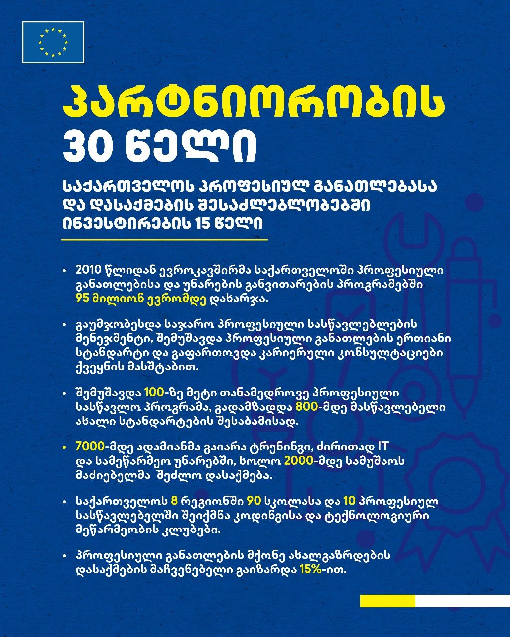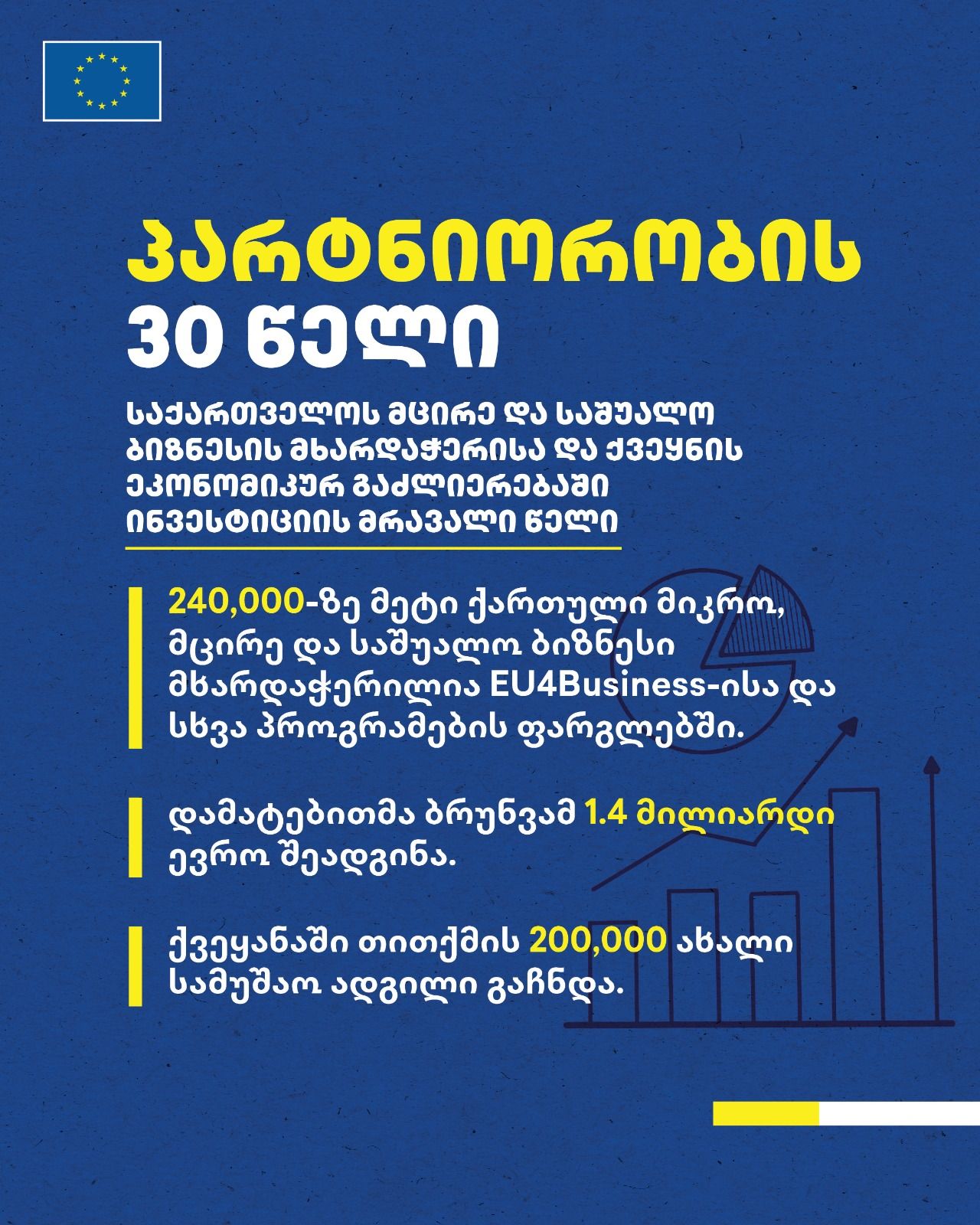 1992 წლიდან ევროკავშირმა საქართველოსთვის 2 მილიარდ ევროზე მეტი ოდენობის გრანტები გამოყო, რითაც დაფინანსდა ახალი ინფრასტრუქტურა, სამუშაო ადგილების შექმნა, განათლება და გარემოს დაცვა. ყოველი ინვესტირებული ევრო მიზნად ისახავდა საქართველოს მოსახლეობის ყოველდღიური ცხოვრების გაუმჯობესებას – გზების, საავადმყოფოებისა და სკოლების მოდერნიზებით დაწყებული, ადგილობრივი თემების, მეწარმეებისა და ახალგაზრდა ნოვატორების გაძლიერებით დასრულებული. უკვე 30 წელზე მეტია ევროკავშირი ისეთი პროგრამების მეშვეობით, როგორიცაა TRACECA, EU4Business, ENPARD თუ EU4Youth, ეხმარება საქართველოს მოქალაქეებს ისარგებლონ ახალი ეკონომიკური და სოციალური შესაძლებლობებით;