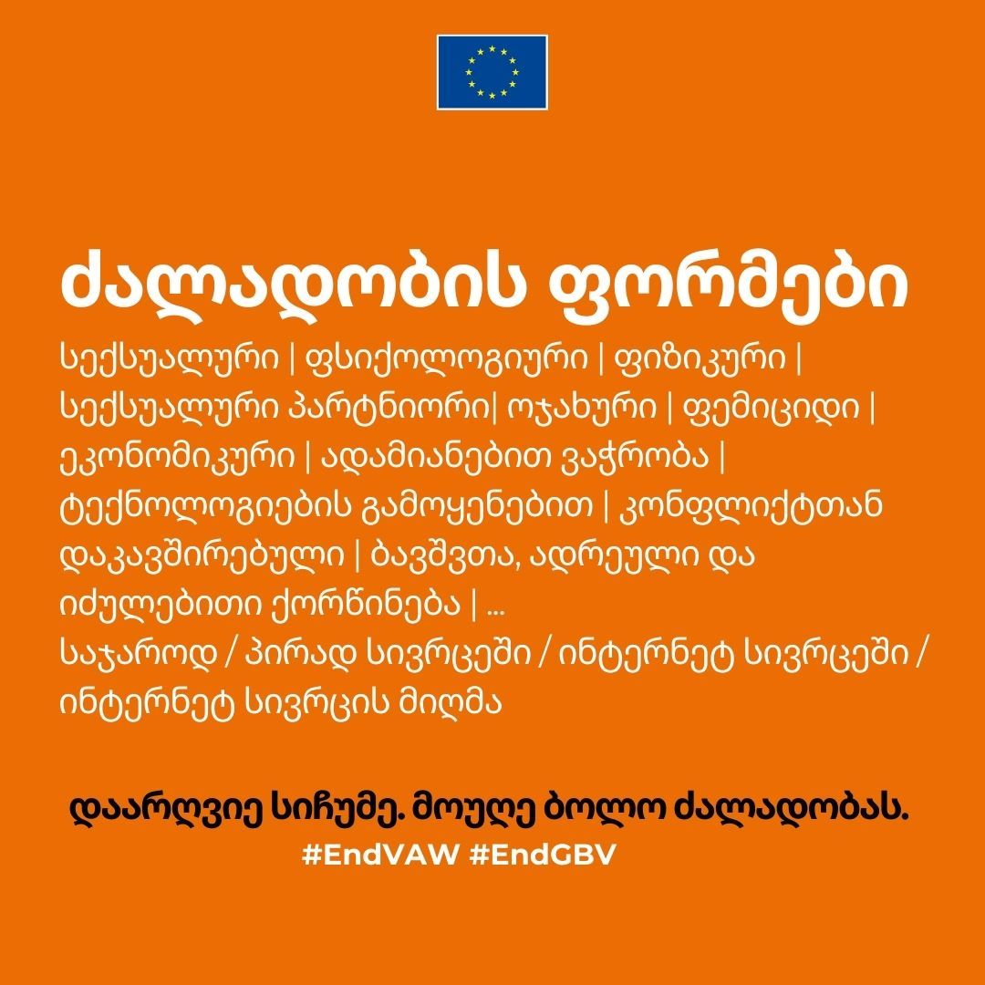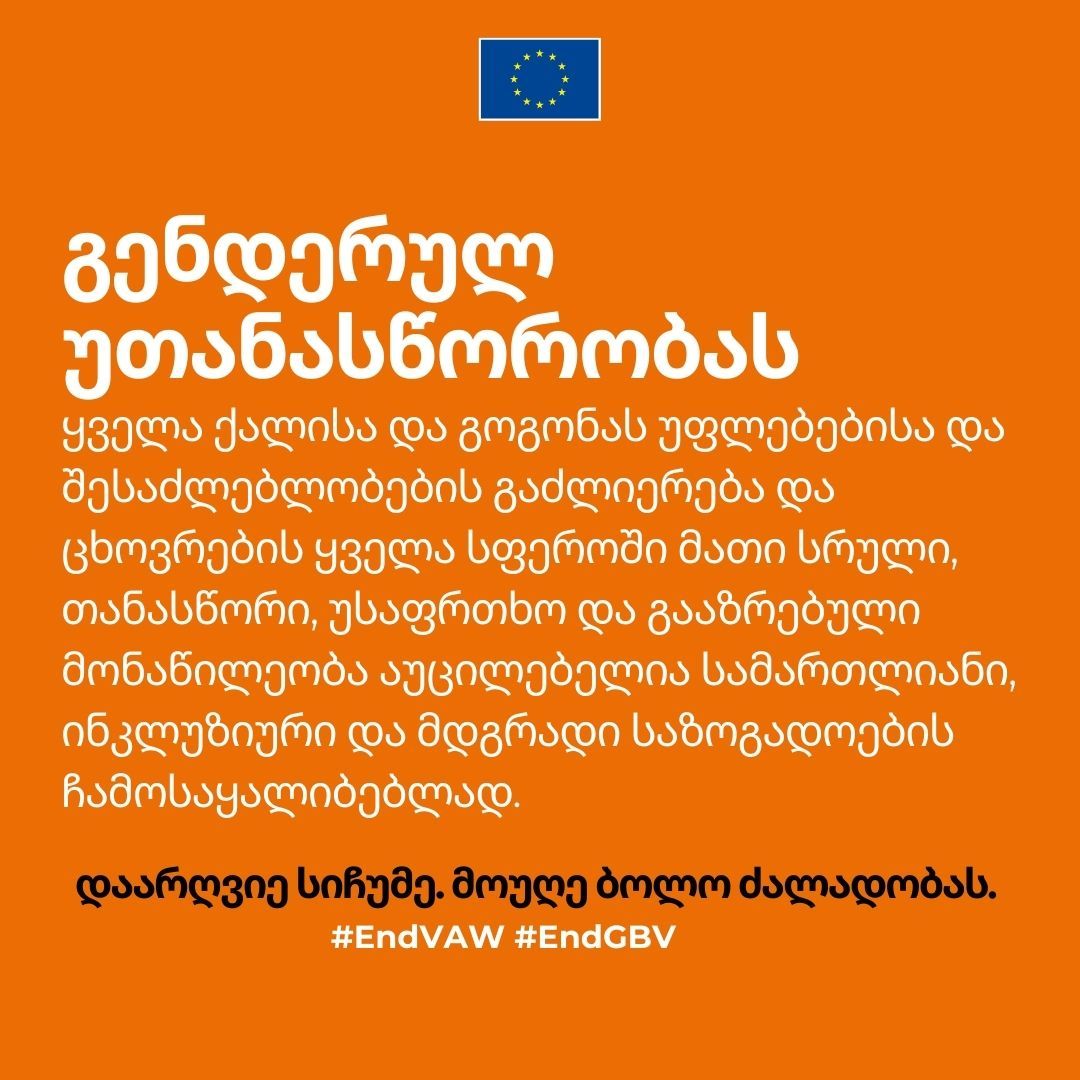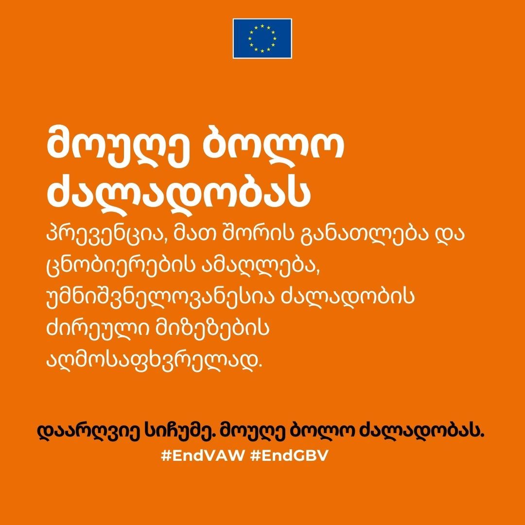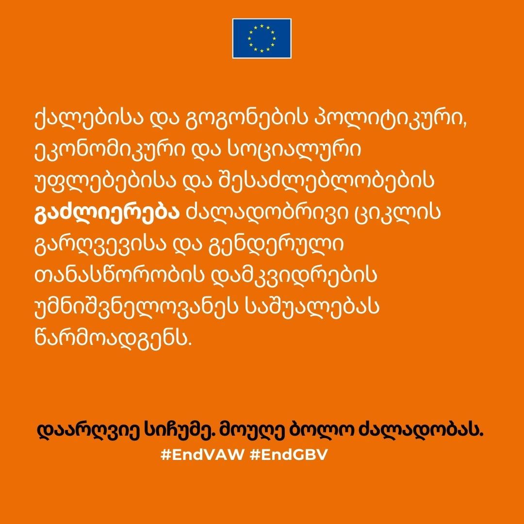 ამ გამოწვევებთან გასამკლავებლად, საქართველოში ევროკავშირი აფინანსებს პროექტებს, რომელიც გენდერული ძალადობის წინააღმდეგ საბრძოლველად სახელმწიფო და არასახელმწიფო აქტორების შესაძლებლობებს აძლიერებს. ჩვენი პროექტები ძალადობის პრევენციის მიზნით ცნობიერებას ამაღლებს და ქალებს უფასო იურიდიულ, სოციალურ ან ფსიქოლოგიურ დახმარებას უწევს. ევროკავშირის მიერ დაფინანსებული პროექტები ასევე სტერეოტიპებისა და მავნე წარმოდგენების შესაცვლელად და საინფორმაციო კამპანიების დასაწყებად მუშაობს. ასევე, ეს პროექტები SafeYou აპლიკაციის გამოყენებას უწყობს ხელს.
